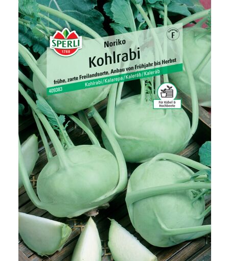 Sperli Kohlrabi Noriko Produktnummer: 0693109327 Der knackige, weiße Kohlrabi Noriko überzeugt mit seinem sehr milden Geschmack. Seine großen Knollen bleiben zart und werden nicht holzig. Die Pflanze entwickelt viel Laub und der Kohlrabi hat einen hohen Strunk. Zudem ist er robust und schossfest. Diese frühe Freilandsorte eignet sich für den Anbau im Frühsommer, Sommer und Herbst. Sie ist sehr robust und schossfest. Der Kohlrabi Noriko kann entweder vorkultiviert oder direkt ausgesät werden Er bevorzugt feuchte Erde mit vielen Nährstoffen. Damit der Kohlrabi richtig gedeihen kann, solltest Du ihm mehrfach Dünger geben. Die Ernte findet von Juni bis Oktober statt. Pflanzzeit Direktsamen: Mai, Juni, Juli Pflanzzeit Vorkultur: März, April Standort: halbschattig, sonnig Erntezeit: Juni, Juli, August, September, Oktober Zum Verzehr geeignet Lebensdauer: einjährig Keimdauer: 7 - 14 Tage optimale Keimtemperatur: 15°C - 20°C Pflanztiefe: 0,5 - 1 cm hoher Ertrag (F1): nein Botanischer Name: Brassica oleracea var. gongylodes Winterhart: nein Inhalt reicht für ca. 50 Pflanzen ...