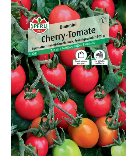 Sperli Cherry-Tomate Umamini F1 Produktnummer: 0693109411 Die Tomate Umamini ist wegen der rosafarbenen Schale ihrer Früchte ein echter Hingucker. Auch geschmacklich überzeugt sie mit einem herzhaften, intensiven Aroma, welches an den charakteristischen Umami - Geschmack erinnert. Mit einem Fruchtgewicht von 15 bis 20 g sind die kleinen, fleischigen Cherrytomaten ideal zum Naschen geeignet. Sie können im Zeitraum von Juli bis Oktober geerntet werden. Im Anbau zeigt sich Umamini flexibel: Die Sorte kann sowohl im Freiland als auch im Hochbeet oder in Kübeln angebaut werden. Pflanzzeit Vorkultur: Februar, März, April Standort: sonnig Erntezeit: Juli, August, September, Oktober Zum Verzehr geeignet Lebensdauer: einjährig Keimdauer: 7 - 14 Tage optimale Keimtemperatur: 20°C - 25°C Pflanztiefe: 0,5 - 1 cm Wuchshöhe: 150 - 200 cm hoher Ertrag (F1): ja Botanischer Name: Solanum lycopersicum Winterhart: nein Inhalt reicht für ca. 5 Pflanzen ...