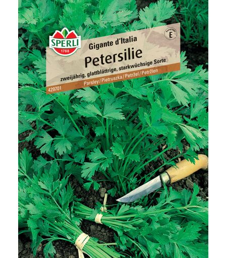 Sperli Petersilie Gigante d'Italia Produktnummer: 0693109257 Die Petersilie Gigante dItalia ist eine sehr wüchsige, aromatische Petersilie mit großflächigen, glatten Blättern. Ihr aromatischer Geschmack passt wunderbar zu Salaten, Soßen und Kartoffel - oder Fleischgerichten. Dabei können die sehr vitaminreichen Blätter frisch oder getrocknet verwendet oder für die spätere Nutzung durch Einfrieren lange haltbar gemacht werden. In Töpfen kann die Aussaat im Haus zwischen Februar und September erfolgen. Etwas kürzer fällt die Aussaatzeit im Freiland auf und erstreckt sich hier von März bis August. Die Ernteperiode fällt in die Zeit von Mai bis Oktober. Pflanzzeit Direktsamen: März, April, Mai, Juni, Juli, August Pflanzzeit Vorkultur: Januar, Februar, März, April, Mai, Juni, Juli, Oktober, November, Dezember Standort: halbschattig, sonnig Erntezeit: Juni, Juli, August, September, Oktober Zum Verzehr geeignet Lebensdauer: zweijährig Keimdauer: 14 - 21 Tage optimale Keimtemperatur: 15°C - 20°C Pflanztiefe: 0,5 - 1 cm hoher Ertrag (F1): nein Botanischer Name: Petroselinum crispum Winterhart: nein Inhalt reicht für ca. 250 Pflanzen ...