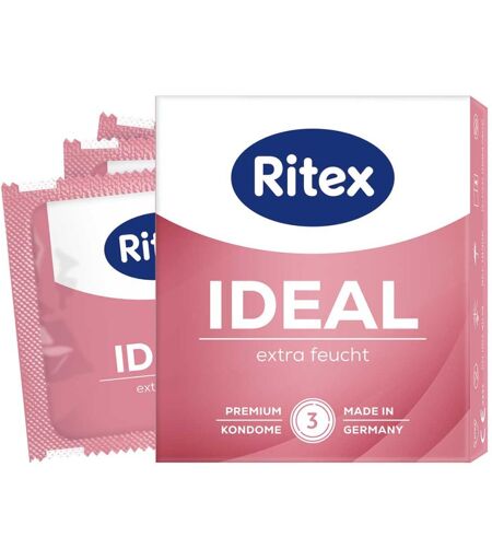 Anwendungsgebiet von Ritex Ideal KondomeRitex Ideal Kondome sind mit 50% mehr Gleitmittel befeuchtet als Ritex Standardkondome. Sie unterstützen vom ersten Moment an die natürliche Gleitfähigkeit - für entspannten und intensiven Sex. Dank ihrer seidenglatten Oberfläche können IDEAL Kondome sehr leicht abgerollt werden. Ritex IDEAL Kondome sind dermatologisch getestet und haben eine sehr gute Hautverträglichkeit. Das besondere Waschverfahren verleiht allen Ritex Kondomen einen angenehmen Geruch. Darüberhinaus werden alle Ritex Kondome ökologisch und sozial nachhaltig hergestellt. Ressourcenschonung, der Einsatz von ÖKO-Strom und ÖKO-Gas sowie die Förderung sozial fairer Arbeitsbedingungen gehören zu den obersten Prinzipien der Unternehmensführung. Medizinprodukt der Klasse II b Geprüft nach EN ISO 4074. Ritex Kondome werden aus Rohstoffen bester Qualität ausschließlich in Deutschland hergestellt. Jedes Kondom wird einzeln elektronisch auf Dichtheit geprüft. Dermatologisch getestet. Premium Qualität Made in Germany.Wirkstoffe / Inhaltsstoffe / ZutatenRitex Ideal Kondome enthält:Inhalt: 3 Ritex Kondome aus Naturkautschuklatex, zartrosa, glatte Oberfläche, zylindrisch, mit Reservoir, Breite (flachliegend) 53 mm, Gleitmittel Dimeticon. GegenanzeigenBei bekannter Überempfindlichkeit gegenüber einem der oben genannten Inhaltsstoffe sollte dieses Produkt nicht angewendet werden. DosierungAnwendung von Ritex Ideal Kondome: Siegelbriefchen behutsam an der Zackenkante aufreißen. Bitte beachten Sie, dass z. B. Fingernägel, Schmuck oder Piercings im Intimbereich das Kondom beschädigen können. Bevor Penis und Körper des Partners sich berühren, das Kondom über den steifen Penis abrollen. Vorhaut ganz zurückziehen, Reservoir mit Daumen und Zeigefinger sanft zusammendrücken, mit Abrollrand nach außen auf die Eichel setzen und das Kondom vollständig abrollen. Sobald der Peni ...