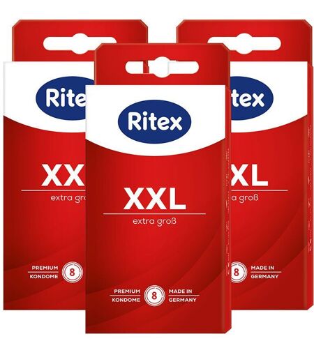 Ritex XXLExtra groß - Mehr KomfortRitex XXL Kondome sind extra groß und bereits im ungedehnten Zustand ca. 200mm lang und 55mm breit. Sie sind hochelastisch und gefühlsintensiv. Ritex XXL sind mit extra viel Gleitmittel beschichtet und bieten daher optimale Sicherheit.Besonderes Waschverfahren - Angenehmer Geruch Dermatologisch getestet* - Sehr gute Hautverträglichkeit Premium Qualität - Made in Germany Inhalt: 3x 8 Ritex XXL Kondome aus Naturkautschuklatex, transparent, glatte Oberfläche, zylindrisch, mit Reservoir, Breite (flachliegend) 55 mm, Gleitmittel Dimeticon. Ritex XXL Kondome sind für die Anwendung beim vaginalen Geschlechtsverkehr bestimmte Medizinprodukte zur Empfängnisverhütung und zum Infektionsschutz. Keine Verhütungsmethode kann einen 100%igen Schutz vor Schwangerschaft und Infektionen garantieren. Jedes Kondom nur einmal benutzen. Kühl, trocken und vor direkter Sonneneinstrahlung geschützt lagern. Nie gemeinsam mit öl- oder fetthaltigen Gleitmitteln/Scheidenzäpfchen verwenden. Bitte beachten Sie die ausführlichen Hinweise auf dem Beipackzettel. ...
