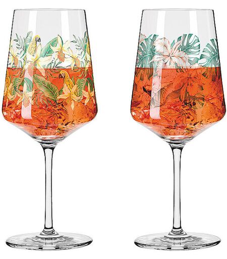 Im Rausch von Flora und Fauna: Exotische Blüten und Blätter und ein Paradiesvogel, der über die kostbaren Gewächse wacht. Die Designs erzählen mit modern illustrierten Motiven von den Schönheiten aus fernen Ländern. AperitifglasSet für SpritzGetränke, Cocktails, Aperitifs, Wein, Schorle, Bowle oder Saft Mit frischen, eleganten Motiven des Ritzenhoff Design Teams Lieferung erfolgt in attraktivem 2erSet Ritzenhoff Markenqualität Made in Germany Hinweis: Vor Gebrauch spülen ...