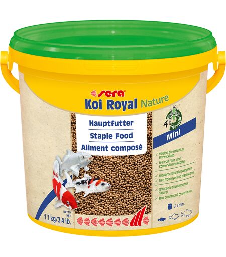 sera Koi Royal Hauptfutter fördert das Wachstum und Wohlbefinden aller jungen und heranwachsenden Koi. Durch die gute Verdaulichkeit eignet es sich ideal zur Fütterung während des ganzen Jahres. Der ausgewogene Gehalt an natürlichen Mineralien, Spurenelementen und zugesetzten Vitaminen fördert die Abwehrkräfte und Vitalität der Koi. Viele Gesundheitskräuter, Vitamine und natürliches Karotin der wertvollen Spirulina-Alge fördern die Farbenpracht der Fische. sera koi Royal ist fettarm, daher besonders leicht verdaulich und hervorragend zur Fütterung auch bei niedrigeren Temperaturen bis zu 8° C geeignet. Mini entspricht 2 mm Pelletgröße. ...