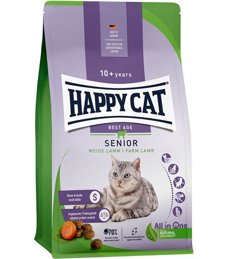 Auch im Alter rundum versorgt sein und vital das Leben genießen – ein wichtiger Baustein hierfür ist eine ausgewogene Ernährung. Speziell für Katzen-Senioren entwickelt ist das Trockenfutter Happy Cat Senior Weide-Lamm. Es zeichnet sich durch eine gut bekömmliche Rezeptur aus und verwöhnt deinen Schmusetiger mit einem köstlichen Geschmack. Das Katzenfutter wird mit Weide-Lamm hergestellt und ist mit pflanzlichen Zutaten wie Karotte und Koriander angereichert. Es versorgt deine Samtpfote mit allen wichtigen Nähr- und Vitalstoffen. Der Gehalt an Proteinen, Natrium und Phosphor ist angepasst, um den Stoffwechsel bei älteren Katzen zu entlasten. Gut zu wissen: Happy Cat Senior Weide Lamm wird mit ausgewählten, natürlichen Rohstoffen in Deutschland hergestellt. Happy Cat Senior Weide-Lamm im Überblick: Hochwertiges Trockenfutter für ältere Katzen ab 8 Jahren .product-description__grid-wrapper { width:100%; display:inline-grid; grid-template-columns: 1fr 1fr; grid-gap: 20px; } @media (max-width: 500px) { .product-description__grid-wrapper { grid-template-columns: 1fr; } } Liebe zur Tradition Erstklassiges Katzenfutter aus einem bayrischen Familienbetrieb mit über 50 Jahren Erfahrung. Keine unnötigen Zusätze Ohne Zucker und frei von künstlichen Farb-, Konservierungs- und Aromastoffen. Beste Verträglichkeit Durch die schonende Verarbeitung bleiben alle wichtigen Nähr- und Vitalstoffe erhalten. So entsteht ein ausgewogenes und artgerechtes Katzenfutter. Einsatz für den Tierschutz Happy Cat verzichtet bewusst auf die Unterstützung von Tierversuchen und setzt sich für verschiedenste Projekte im Umwelt- und Tierschutz ein. Maßgeschneidert für Senioren: abgestimmte Zusammensetzung für Katzen in fortgeschrittenem Alter, komplett und ausgewogen, Unterstützung der Mobilität Schmackhaftes Lammfleisch: mit gut bekömmlichem Weide-Lamm zubereitet Angepasster Gehalt an Proteinen, Natrium und Phosphor: dient der Unterstützung des Stoffwechsels Pflanzliche Zutaten: verfeinert mit ausgewählten Kräutern und anderen Zutaten, z.B. Karotten und Koriander Angereichert mit grünlippiger Neuseelandmuschel Hohe Akzeptanz: sehr schmackhaft, wird von vielen Katzen gut angenommen Ohne Soja hergestellt Herstellungsort: Deutschland ...