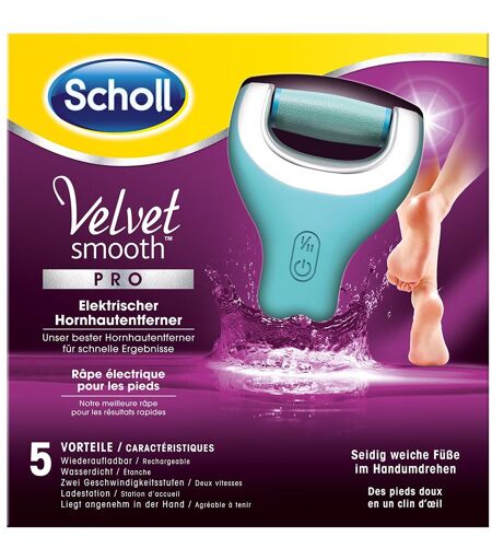 Mit dem Velvet Smooth™ Elektrischen Hornhautentferner PRO von Scholl lässt sich die elektrische Hornhautentfernung jetzt nocheinfacher in die tägliche Pflegeroutine integrieren. Egal ob auf trockener oder nasser Haut –der wasserdichte Velvet Smooth™ PRO überzeugt mit Ergebnissen auf Profi-Niveau und macht das heimische Badezimmer zur Wellness-Zone. Dank seiner flexiblen Anwendung hat jeder Liebhaber schön gepflegter Füße die Wahl: Express-Behandlung unter der Dusche oder ausgiebige Spa-Session bei Schaumbad und Kerzenlicht –der Velvet Smooth™ PRO sorgt für rundum seidig weiche Füße im Handumdrehen. Bewegen Sie das Gerät über die verhornten Stellen am Fuß und sehen Sie, wie schnell und einfach die Hornhaut entfernt wird. Mehr Flexibilität bietet der neue Velvet Smooth™ PRO auch durch seine Ladestation, die für konstante Leistung sorgt. Bequem überdas Stromnetz aufladbar, ist er somit jederzeit einsatzbereit. Eine weiterer Vorteil sind die zwei Geschwindigkeitsstufen. Sie ermöglichen sowohl die sanfte als auch die gründliche und schnelle Entfernung verhärteter Hautstellen. Das Tempo und die Intensität der Pflege richten sich dabei allein nach Ihren individuellen Bedürfnissen. Mit seiner eleganten, ergonomischen Form liegt der neue Velvet Smooth™ PRO optimal in der Hand, was den Bedienkomfort zusätzlich erhöht –Wellness pur auch in dieser Hinsicht. Sein Konzept und seine Ausstattung machen den Velvet Smooth™ PRO zu einer echten Premium-Lösung für alle, die hohe Ansprüche an ihre Schönheitspflege haben und genauso viel Wert auf gepflegte Füße wie auf größtmögliche Flexibilität bei der Anwendung legen. Zum Produktumfang gehören neben dem elektrischen Hornhautentferner zur Anwendung auf trockener und nasser Haut, eine Rolle Stark“ sowie eine Ladestation, ein Kabel und ein Netzstecker zum einfachen und schnellen Aufladen. Scholl's bester Hornhautentferner für schnelle Ergebnisse und seidig weiche Füße im Handumdrehen Durch sein wasserdichtes Gehäuse sowohl zur die Anwendung in der Dusche od. Badewanne auf nassen Füßen als auch zur Trockenanwendung geeignet Mit zwei Geschwindigkeitsstufen für die individuelle Hornhautentfernung Kabellos, mit wiederaufladbaremAkku plus Ladestation ausgestattet Elegante, ergonomische Form, die angenehm in der Hand liegt Anwendung: Achten Sie darauf, dass die Rolle sicher im Gerät sitzt. Nur mit eingesetzter Rolle benutzen. Durch Drücken des An-Knopfes wird das Gerät ein-und ausgeschaltet. Unter Verwendung des Knopfes mit Zeichen "I/II" schalten Sie zwischen der niedrigen und hohen Geschwindigkeit um. Bewegen Sie das Gerät sanft über die verhornten Hauptpartien am Fuß und entfernen Sie überschüssige Hornhaut, bis Sie das gewünschte Maß an Geschmeidigkeit erreicht haben. Bei zu starkem Druck schaltet das Gerät durch den integrierten Sicherheitsstopp ab. Entfernen Sie die losen, abgestorbenen Hautpartikel mit einem Tuch oder Wasser, und trocknen Sie Ihre Füße. Für optimale Ergebnisse tragen Sie im Anschluss eine... ...