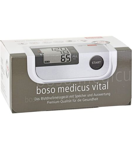 Anwendungsgebiet von Boso medicus vital Oberarm BlutdruckmessgerätDas Blutdruckmessgerät boso-medicus vital ist für Patienten geeignet, deren Oberarmumfang zwischen 22 und 48 cm liegt.Nichtinvasive Erfassung des systolischen und diastolischen Blutdruckwertes sowie der Pulsfrequenz von Erwachsenen. Präzises Blutdruckmessen am Oberarm – klinisch validiert nach ESH Mittelwertfunktion für die Beurteilung des Blutdrucks nach WHO Anzeige von Herzrhythmusstörungen und deren Häufigkeit Speicher für 60 Messwerte für Langzeitprofil Intelligente Aufpumpautomatik für Messung ohne Nachpumpen, inklusive Bewegungssensor Universalmanschette für Armumfänge von 22 bis 42 cm Etui und Alkaline-Batterien inkl. 3 Jahre Qualitätsgarantie Optional kann an das Gerät ein Netzteil sowie folgende Manschetten angeschlossen werden: Standard-Manschette für Armumfang 22 – 32 cm, XL-Manschette für Armumfang 32 – 48 cm Lieferumfang von Boso medicus vital Oberarm Blutdruckmessgerät: 1 Blutdruckmessgerät boso-medicus vital 1 Universalmanschette CA 04 1 Etui 1 Blutdruckpass 4 Batterien LR 6 (AA) 1 Gebrauchsanweisung Boso medicus vital Oberarm Blutdruckmessgerät können in Ihrer Versandapotheke www.juvalis.de erworben werden. ...