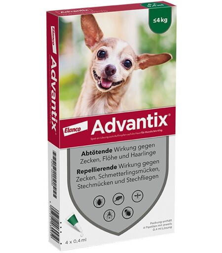 Advantix Spot-On 40 für sehr kleine Hunde bis 4 kg Körpergewicht gegen Zecken, Flöhe und fliegende Insekten, bis zu 4 Wochen Wirksamkeit Advantix Spot-On für Hunde schützt vor Zecken & Mücken vor dem Stich! Parasiten, wie Flöhe, Zecken oder fliegende Insekten sind nicht nur besonders störend, sondern stellen auch ein gesundheitliches Risiko für Hunde dar. Sie können allergische Reaktionen oder Hautkrankheiten auslösen, bakterielle Infektionen verursachen und Krankheiten oder Parasiten übertragen. Advantix Spot-on ist ein wirksames und gut verträgliches Parasitenmittel und bietet einen Mehrfachschutz: Advantix tötet Flöhe, Zecken und Haarlinge auf dem Hund bei Kontakt ab und schützt vor erneutem Befall. Zusätzlich wirkt Advantix repellierend, also abwehrend gegen Zecken, Stechfliegen und Sand- sowie Stechmücken. Parasiten müssen also gar nicht erst stechen, um den Wirkstoffen aufzunehmen. Das ist insbesondere für Urlaube in Mittelmeerregionen in und außerhalb Europas ein wichtiger Produktvorteil. Dank dem abwehrenden Effekt verringert Advantix das Risiko einer Übertragung von Krankheitserregern, wie dem Leishmaniose-Erreger. Die Anwendung ist praktisch und einfach: Advantix wird als Spot-On auf die Haut des Hundes geträufelt und verteilt sich dort durch den natürlichen Fettfilm auf Haut- und Fell gleichmäßig über die gesamte Körperoberfläche. Es verbleibt rein äußerlich auf der Haut und dem Fell des Tieres. Dabei ist die Flüssigkeit wasserbeständig, die Wirkung wird also durch Baden oder einen Spaziergang im Regen nicht beeinträchtigt*. Die Kombination der Wirkstoffe macht es möglich Advantix enthält zwei Wirkstoffe: Permethrin und Imidacloprid. In Kombination wirken sie gegen Zecken, Flöhe, Stechmücken, Sandmücken, Haarlinge und Stechfliegen. Dabei ist Advantix Spot-On gut verträglich und kann bereits bei Welpen ab der 7. Lebenswoche oder 1,5 kg Körpergewicht und auch bei trächtigen und laktierenden Hündinnen angewendet werden. Für wen ist Advantix Spot-On das richtige Produkt? • wenn Sie Ihren Hund vorbeugend gegen Zecken, Flöhe und fliegende Insekten schützen möchten • wenn Ihr Hund mit einem lästigen Haarlingsbefall zu kämpfen hat • wenn Sie eine äußerliche Behandlung mit breitem Wirkspektrum für Ihren Hund bevorzugen • wenn Sie Ihre Hundewelpen ab der 7. Lebenswoche schützen möchten • wenn Sie in Regionen leben oder Urlaub machen wollen, die als Leishmaniose gefährdete Gebiete eingestuft werden oder wenn die Gefahr einer Herz- oder Hautwurm-Übertragung durch Sandmücken möglich ist. Eine zusätzliche Herzwurmprophylaxe ist notwendig. Bitte wenden Sie sich an Ihren Tierarzt. Anwendungsgebiet: Zecken, Flöhe, Sandmücken, Stechfliegen und Stechmücken Zur Sofortbekämpfung bei massiven Flohbefall (Ctenocephalides felis) Abtötung von Haarlingen Zur Sofortbekämpfung und Vorbeugung von Zeckenbefall Zecken, Sandmücken, Stechmücken, und Stechfliegen werden vor dem Stich abgewehrt Wirkt auch nach dem Baden und Schwimmen* In fünf Größen für alle Hunde... ...