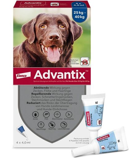 Advantix Spot-On 400 für große Hunde bis 40 kg Körpergewicht gegen Zecken, Flöhe und fliegende Insekten, bis zu 4 Wochen Wirksamkeit Advantix Spot-On für Hunde schützt vor Zecken & Mücken vor dem Stich! Parasiten, wie Flöhe, Zecken oder fliegende Insekten sind nicht nur lästig, sondern können auch allergische Reaktionen oder Hautkrankheiten auslösen, zu sekundären, bakteriellen Infektionen führen und sogar Krankheiten oder Parasiten übertragen. Mit Advantix Spot-on steht zum Schutz des Hundes ein wirksames und gut verträgliches Parasitenmittel zur Verfügung. Advantix tötet Flöhe, Zecken und Haarlinge auf dem Hund bei Kontakt ab und schützt vor einem erneuten Befall. Außerdem wirkt Advantix repellierend, also abwehrend gegen Zecken, Stechfliegen und Sand- sowie Stechmücken. Das bedeutet, dass diese Parasiten nicht stechen müssen, um den Wirkstoff aufzunehmen. Dies ist nicht nur hier in Österreich, sondern auch bei Urlauben in Mittelmeerregionen in und außerhalb Europas ein wichtiger Produktvorteil. Durch den abwehrenden Effekt verringert Advantix das Risiko einer Übertragung von Krankheitserregern, wie dem Leishmaniose-Erreger. Die Anwendung ist einfach: Advantix wird als Spot-On auf die Haut des Hundes geträufelt und verteilt sich dort durch den natürlichen Fettfilm auf Haut- und Fell gleichmäßig über die gesamte Körperoberfläche. Es verbleibt also rein äußerlich auf der Haut und dem Fell des Tieres. Dabei ist die Flüssigkeit wasserbeständig, die Wirkung wird also durch Baden oder einen Spaziergang im Regen nicht beeinträchtigt*. Die Kombination der Wirkstoffe macht es möglich: Advantix enthält zwei Wirkstoffe: Permethrin und Imidacloprid. In Kombination wirken sie gegen Zecken, Flöhe, Stechmücken, Sandmücken, Haarlinge und Stechfliegen. Dabei ist Advantix Spot-On besonders verträglich und kann bereits bei Welpen ab der 7. Lebenswoche oder 1,5 kg Körpergewicht und auch bei trächtigen und laktierenden Hündinnen angewendet werden. Für wen ist Advantix Spot-On das richtige Produkt? • wenn Sie Ihren Hund vorbeugend gegen Zecken, Flöhe und fliegende Insekten schützen möchten • wenn Ihr Hund mit einem lästigen Haarlingsbefall zu kämpfen hat • wenn Ihnen eine stressfreie, äußerliche Behandlung Ihres Hundes wichtig ist • wenn Sie Ihre Hundewelpen ab der 7. Lebenswoche schützen möchten • wenn Sie in Regionen leben oder Urlaub machen wollen, die als Leishmaniose gefährdete Gebiete eingestuft werden oder wenn die Gefahr einer Herz- oder Hautwurm-Übertragung durch Sandmücken möglich ist. Eine zusätzliche Herzwurmprophylaxe ist notwendig. Bitte wenden Sie sich an Ihren Tierarzt. *Allerdings sollte längeres und intensives Durchnässen vermieden werden. Bei Häufigem Durchnässen kann die Wirkdauer verkürzt sein. Baden ist 48 Stunden nach der Anwendung möglich. Anwendung: Wie wird Advantix angewendet? Je nach Gewicht Ihres Hundes wird eine Pipette Advantix Spot-On aus der Packung entnommen. Nehmen Sie den Deckel der Pipette ab und stechen Sie die Pipette mit... ...