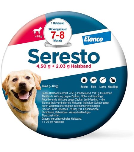 brAnwendungsgebiet von Seresto Halsband für Hunde über 8 kg gegen Zecken und Flöhe Seresto Halsband für Hunde über 8 kg gegen Zecken und Flöhe bietet Schutz gegen Flöhe und wehrt Zecken ab, bevor sie stechen können. Ganz einfach durch Kontakt mit Haut und Fell des Hundes werden die Zecken abgetötet. Seresto Halsband für Hunde über 8 kg gegen Zecken und Flöhe ist auch zum Schutz auf Reisen gut geeignet, da das Leishmaniose-Infektionsrisiko des Hundes durch den von Sandmücken übertragenen Erreger bis zu 8 Monate verringert wird.Ein Befall mit Flöhen und Zecken ist nicht nur lästig, er kann auch gesundheitliche Folgen für den Hund haben. Ein Flohbiss kann zu starkem Juckreiz, Rötungen bis hin zu Allergien führen. Mit dem Zeckenbiss – genauer heißt es Stich – können gefährliche Krankheitserreger auf den Hund übertragen werden. Seresto beinhaltet zwei Wirkstoffe: Imidacloprid tötet ausgewachsene Flöhe und ihre Larven bei Kontakt mit dem behandelten Tier ab. Flumethrin wehrt und tötet Zecken ab. In keinem anderen Flohmittel oder Zeckenmittel wirken diese beiden Wirkstoffe gemeinsam. Das Seresto Zeckenhalsband wehrt und tötet Zecken und tötet Flöhe ab – ganz einfach durch Kontakt mit Haut und Fell des Hundes. Das bedeutet, Zecken müssen Ihren Hund nicht erst stechen, um wirksam abgetötet zu werden. So wird indirekt das Risiko für die Übertragung bestimmter Krankheitserreger durch Zeckenstiche verringert. Ein weiterer Vorteil von Seresto: es verringert das Leishmaniose-Infektionsrisiko des Hundes. Der Erreger der Leishmaniose, Leishmania infantum, wird von Sandmücken übertragen. Dadurch ist es auch ausdrücklich zum Schutz auf Reisen gut geeignet. Das Besondere am Seresto Halsband: es gibt seine Wirkstoffe kontrolliert in geringen, aber wirksamen Mengen ab. So wird Ihr Hund bis zu 8 Monate lang gegen Flöhe und Zecken geschützt. Der Wirkstoff verbleibt im natürlichen Fettfilm von Haut und Fell. Das ...