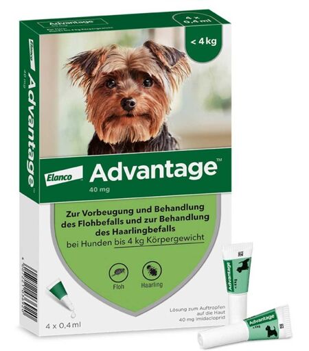 Anwendungsgebiet von Advantage Spot-On für Hunde bis 4 kg Mit Advantage® Spot-On Flohbefall effektiv und langfristig behandelnWenn der eigene Hund Flöhe hat, ist die konsequente Behandlung der Fellnase mit Advantage® Spot- On die erste Maßnahme. So können die auf dem Tier befindlichen Parasiten innerhalb kurzer Zeit nach Gabe abgetötet werden, so dass es nicht zu weiteren Stichen kommt und die Flöhe sich nicht noch weiter vermehren können. In der Regel ist der sichtbare Flohbefall auf dem Hund nur die Spitze des Eisberges. Deshalb ist es wichtig, die Flohnachkommen, nämlich die Eier, Larven und Puppen der Flöhe in der häuslichen Umgebung zu bekämpfen bzw. deren Vermehrung und Entwicklung zu stoppen.Advantage® tötet auf dem Hund befindliche Flöhe rasch ab und kann so bereits verhindern, dass die Flöhe Blut saugen und Eier legen können. Außerdem bietet Advantage® den Vorteil, dass es Flohlarven in der unmittelbaren Umgebung des behandelten Tieres abtötet, wenn diese mit dem Wirkstoff in Kontakt kommen.Zusätzlich beugt es erneutem Flohbefall bis zu 4 Wochen vor. Weitere Maßnahmen sollten die gründliche Reinigung aller Teppiche und Polster oder auch des Lieblingsplätzchens des Vierbeiners sein sowie Textilien, wie Kissen und Decken bei mindestens 60 °C zu waschen. Bei hartnäckigem Flohbefall kann es nötig werden, die Behandlung zusätzlich mit einem Umgebungsspray zu ergänzen, um nicht erreichte Flohlarven und -eier abzutöten. Für wen ist Advantage® Spot-On das richtige Produkt?• wenn Sie Flöhe an Ihrem Tier entdeckt haben und rasch handeln wollen• wenn Sie Ihr Tier langfristig gegen Flöhe schützen möchten• wenn Ihr Hund mit einem lästigen Haarlingsbefall zu kämpfen hat• wenn Ihnen eine stressfreie, äußerliche Behandlung Ihres Vierbeiners wichtig ist• wenn Sie Ihre Hundewelpen ab der 8. Lebenswoche gegen Flohbefall schützen möchten Wirkungsweise von Advantage Spot-On für Hund ...
