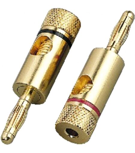LS-Bananenstecker-Paar, 4 mm: Gespleißte Kontaktführung, Vergoldete High-End-Ausführung, Querloch für Kabelaufnahme bis Ø 7 mm, Kabelandruckschraube mit Ø-4-mm-Bohrloch zur Aufnahme eines weiteren Bananensteckers, Technische Daten: Art: Stecker, Typ: LS-Bananen, Anzahl: 2, Ausstattung: vergoldet, Farbe/Farbcodierung: Rot/Schwarz, Kabeleinlass: Ø 7 mm, Material: Metall, Kontaktart: gespleißte Kontaktführung, Zul. Einsatztemperatur: 0-40 °C, Gewicht: 38 g (Paar), Sonstiges: Kabelandruckschraube mit Ø-4-mm-Bohrloch zur Aufnahme eines weiteren Bananenstecker ...