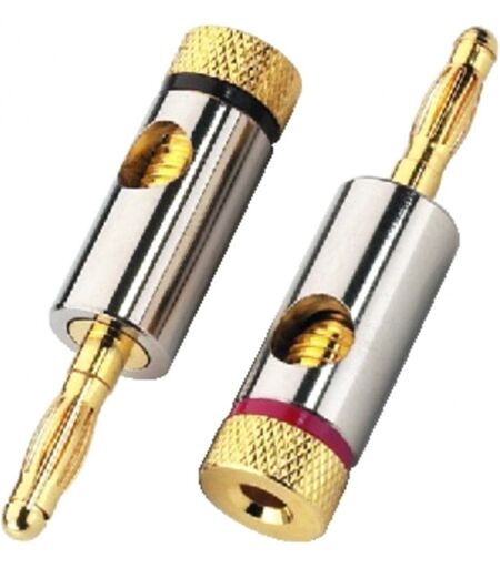 LS-Bananenstecker-Paar, 4,5 mm: Gespleißte Kontaktführung, Vernickeltes Gehäuse mit vergoldeten Kontakten, Querloch für Kabelaufnahme bis Ø 6,5 mm, Kabelandruckschraube mit Ø-4-mm-Bohrloch zur Aufnahme eines weiteren Bananensteckers, Technische Daten: Art: Stecker, Typ: LS-Bananen, Anzahl: 2, Ausstattung: vergoldet, Farbe/Farbcodierung: Rot/Schwarz, Kabeleinlass: Ø 6,5 mm, Anschluss: Kabelandruckschraube mit 4-mm-Bohrloch für Bananenstecker, 6,5-mm-Querloch, Material: Vernickeltes Gehäuse/Vergoldete Kontakte, Zul. Einsatztemperatur: 0-40 °C, Gewicht: 38 g (Paar) ...