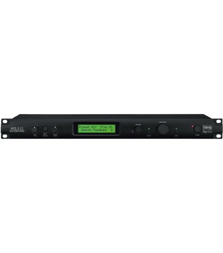 Stereo-DSP-Feedback-Controller: Verhindert auftretende Rückkopplungen in Beschallungsanlagen, 12 steilflankige Präzisions-Notchfilter pro Stereokanal, Editierbare Filterparameter (Software im Lieferumfang), 4 Werkspresets, 16 Userpresets, Mono- oder 2-Kanal-Betrieb möglich, 24-Bit-AD/DA-Auflösung, 45-dB-Dämpfung (mit schrittweiser Reduzierung im Variabel-Modus), Wahlweise ständige Signalüberwachung (Auto Notch) oder manuelles Setzen der benötigten Filter (Manual Notch), Hintergrundbeleuchtetes 2x20-Dot-Matrix-Display, Eingangs- und Ausgangs-Level regelbar, Bypass-Funktion, Clip-LED, Symmetrische XLR- und 6,3-mm-Klinken-Ein- und Ausgänge, USB-A-Anschluss, MIDI-Ein- und Ausgang, 482-mm-Rackeinbau (19"), 1 HE, Xound 2014/6: „Ein interessantes Tool für den Live-Bereich, mit dem sich so manches knifflige Feedbackproblem in den Griff bekommen lässt. Ganz gleich, ob für Monitor oder FOH-Zwecke, der Controller MFE-212 leistet gute Dienste. Beim Umschalten in den Bypass-Mode, konnte man keine hörbaren Klangunterscheide feststellen, d. h. der Controller liefert eine klare und saubere Soundperformance.“Technische Daten: Art: Feedback-Controller, Frequenzbereich: 20-20000 Hz, Eingangssignal: 2,2 V max., Ausgangssignal: 2,2 V max., Störabstand: > 90 dB, Klirrfaktor: , Zul. Einsatztemperatur: 0-40 °C, Stromversorgung: ˜ 230 V/50 Hz/20 VA, Abmessungen: 482 x 44 x 193 mm, 1 HE, Gewicht: 2 kg, Eingänge: 1 x XLR L/R, sym. (Line)1 x 6,3-mm-Klinke L/R (Line) , Ausgänge: 1 x XLR L/R, sym. (Line)1 x 6,3-mm-Klinke L/R (Line) , Sonstiges: MIDI-In/Out (2x5-Pol-DIN) USB-A-Buchse ...