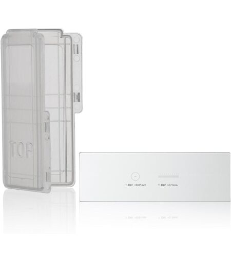 BRESSER Objektträger Mikrometerskala 1/10 & 1/100 mm Objektträger mit Mikrometer-Skala dienen der Kalibration für eine Vermessung. Sie werden zusammen mit einem Mikrometer-Okular oder einer Mess-Software (für Kameras) für die Vermessung von Präparaten eingesetzt. Praktische grobe Skala Die grobe Skala eignet sich für geringe Vergrößerungen, die feine Skala eignet sich für hohe Vergrößerungen. ...