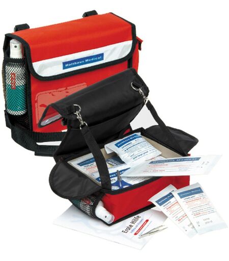 Umhängetasche aus Nylon mit verstellbarem Trageriemen und Schulterpolster. Der Trageriemen kann sowohl als Rucksack als auch seitlich über die Schulter getragen werden. Ein Reflektorstreifen auf der Vorderseite der Tasche sorgt für die erforderliche Sicherheit in der Dämmerung oder Dunkelheit. Auf der Innenseite befinden sich 2 Riemen mit Karabinerhaken, die eine 90°- Stop Arretierung ermöglichen. So steht der Inhalt im Notfall schnell und übersichtlich zur Verfügung. Auf der Vorderseite befindet sich eine transparente Fenstertasche zum Einschieben eines Papiers mit Namen und Adresse der Einrichtung.Inkl. 93-teiliger Füllung Abmessungen: 24 x 19 x 8 cm ...