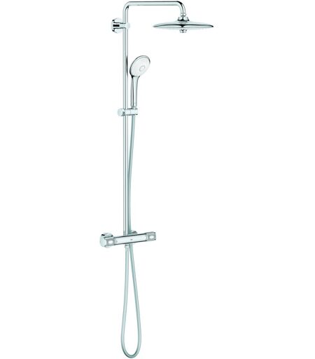 GROHE Duschsystem Euphoria System 260 27296_3, mit Thermostatbatterie mit Aquadimmer, Wandmontage, 450 mm Duscharm, Kopfbrause Euphoria 260 (26455), Handbrause Euphoria 110 Massage (27221), GROHE CoolTouch, chrom, 27296003 Euphoria System 260 Duschsystem mit Thermostatbatterie für die Wandmontage bestehend aus: horizontal schwenkbarer 450 mm Brausearm Aufputz-Thermostat mit Aquadimmer Funktion ermöglicht den Wechsel zwischen: Euphoria 260 Kopfbrause (26 455) 3 Strahlarten: Rain, SmartRain, Jet Maximaler Durchfluss (bei 3 bar): 7,5 l/min mit Kugelgelenk, Drehwinkel ± 15° Handbrause Euphoria 110 Massage (27 221) 3 Strahlarten: Rain, Massage, SmartRain Maximaler Durchfluss (bei 3 bar): 11 l/min in der Höhe verstellbar mittels Gleitelement Silverflex Brauseschlauch 1.750 mm 1/2'' x 1/2'' (28 388) GROHE TurboStat Kompaktkartusche mit Dehnstoff-Thermoelement GROHE SafeStop Sicherheitssperre bei 38°C GROHE SafeStop Plus optional einsetzbarer Temperaturendanschlag bei 43°C GROHE CoolTouch kein Verbrennen an heißen Oberflächen GROHE ProGrip mit Rändelstruktur GROHE DreamSpray Perfektes Strahlbild GROHE Long-Life Oberfläche GROHE SprayDimmer stufenlose Reduktion der Durchflussmenge GROHE FastFixation obere Konsole variabel Innenliegende separate Wasserführung SpeedClean Antikalk-System TwistStop gegen Verdrehen des Brauseschlauchs für Durchlauferhitzer ab 18 kW/h geeignet Mindestdurchfluss 7 l/min optionales Zubehör: GROHE EasyReach Ablage (26 362) ...