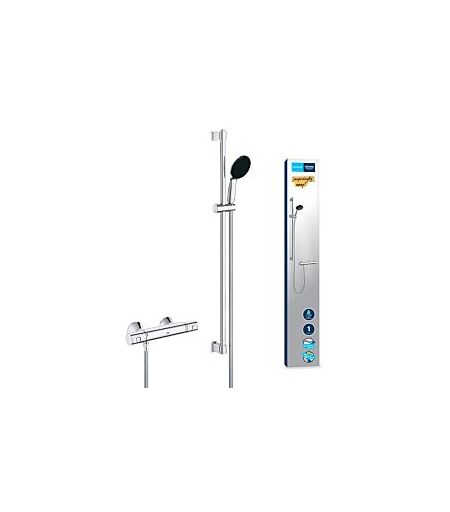 Grohe Precision Start Duschthermostat 34854001Die GROHE Precision Start Brausegarnitur ist dank QuickFix System einfach selbst zu installieren und wertet Ihr Bad mit dem Komfort der neuesten Thermostat-Technologie aufmit Brausestangenset 1 Strahlart (Rain)bestehend aus:Precision Start Thermostat-Brausebatterie 1/2" (34 594)Vitalio Start 110 Brausestangenset, 900 mm (26 953)geeignet zum Bohren (Schrauben und Dübel beiliegend) oder Kleben (GROHE QuickGlue S 41 247 000 seperat erhältlich - 2 x erforderlich)Belastbarkeit der Brausestange: max. 20 kgDie angegebene Gewichtskraft gilt für eine statische (langsam aufgebrachte) Belastung und bestimmungsgemäßen GebrauchGROHE QuickSpanner beiliegend ...