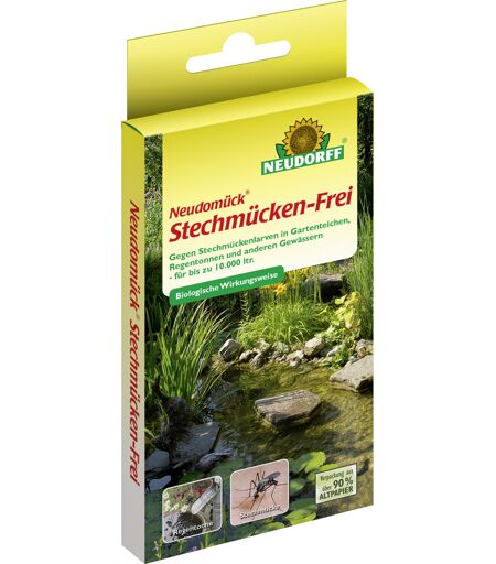 Stechmückenfrei 10 Tabletten Produktnummer: 0688501368 Biologisches Präparat zur Bekämpfung von Stechmücken-Larven in Regenfässern, Gartenteichen und anderen Gewässern. Fische, Pflanzen, Libellen, Frösche und andere Wasserorganismen werden nicht beeinträchtigt. Wirkt bis zu 4 Wochen. Anwendungsart: gebrauchsfertig Anwendungsbereich: zur Bekämpfung von Stechmücken-Larven Einsatzbereich: in Regenfässern, Gartenteichen und anderen Gewässern. Anwendungsform: lösbare Tabletten Anwendungsmenge: Teich: 1 Tablette ausreichend für 100 Liter Wasser; Regentonne: 1 Tablette ausreichend für 50 Liter Wasser. Wirkstoff: Bacillus thuringiensis subspec. Israelensis Anwendungszeit: März - Oktober Herstellerinformationen: W. Neudorff GmbH KG An Der Mühle 3 31860 Emmerthal, Deutschland eMail: info@neudorff.de Herstellernr. 00389 Verbraucherhinweise Sicherheitshinweise Ist ärztlicher Rat erforderlich, Verpackung oder Kennzeichnungsetikett bereithalten.Darf nicht in die Hände von Kindern gelangen.BEI KONTAKT MIT DEN AUGEN: Einige Minuten lang behutsam mit Wasser spülen. Eventuell vorhandene Kontaktlinsen nach Möglichkeit entfernen. Weiter spülen.Schutzhandschuhe / Schutzkleidung / Augenschutz / Gesichtsschutz / Gehörschutz tragen.Sofort GIFTINFORMATIONSZENTRUM/Arzt anrufen. ...