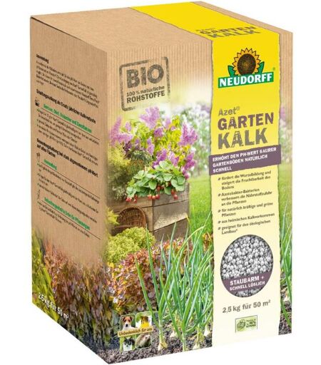 Neudorff Azet Gartenkalk 2,5 kg Produktnummer: 0688301474 Kalk wird dem Boden entzogen durch Pflanzenwachstum, Auswaschung und Säurebelastung aus dem Niederschlag. Die Erde kann dadurch zu sauer und Nährstoffe von den Pflanzen nicht mehr aufgenommen werden. Kontrollieren Sie darum zuerst den pH-Wert Ihres Bodens und kalken bei Bedarf. Azet GartenKalk ist ein Bodenverbesserer aus natürlichen Rohstoffen für kräftige und widerstandsfähige Pflanzen. Er enthält die lebenswichtigen Nährstoffe Calcium und Magnesium. Bodenlebende Mikroorganismen fördern die Wurzelbildung und sorgen für ein kräftiges Wachstum der Pflanzen. Der granulierte, staubarme, schnell lösliche Azet GartenKalk reguliert den pH-Wert innerhalb weniger Tage. Die Fläche kann nach dem Ausbringen sofort wieder genutzt werden. Als vorbereitende Maßnahme ermitteln Sie den pH-Wert des Bodens mit dem pH-Bodentest von Neudorff. Die Ausbringung von Azet® GartenKalk ist ganzjährig möglich. Sie können ihn sowohl einzeln als auch zusammen mit Neudorff Terra Preta® BodenVerbesserer, Bentonit SandbodenVerbesserer oder Neudorffs UrgesteinsMehl ausbringen. Erhaltungskalkung als Ersatz jährlicher Kalkverluste Gemüse, Obst, Sträucher und Zierpflanzen: Gesundungskalkung bei stark abgesunkenem pH-Wert auf allen Flächen: Anwendung: Selbsthergestellte Erde für Pflanzungen: Empfehlungen der amtlichen Beratung gehen vor Düngerbasis: organisch-mineralisch Anwendungszeitraum: Januar - Dezember Ausführung: Festdünger Gebrauchsanweisung/Düngeanleitung:bringen Sie 50-100 g/m² Azet® GartenKalk gleichmäßig mit der Hand aus und arbeiten Sie diesen leicht ein, um geringe Kalkverluste auszugleichen, optimale Zeitpunkte sind Februar/März oder Oktober die meisten Rhododendronarten vertragen keinen Kalk im Boden und benötigen einen niedrigen pH-Wert (pH 4-5). Daher hier keinen Azet® GartenKalk streuen das Ergebnis des pH-Bodentests von Neudorff gibt die auszubringende Kalkmenge vor bringen Sie den Azet® GartenKalk gleichmäßig mit der Hand aus und arbeiten Sie ihn leicht ein bei sehr hohem Kalkbedarf die Gabe auf zwei Anwendungszeitpunkte verteilen mischen Sie bei Bedarf zur Anhebung des pH-Wertes um eine Einheit 5 g Azet® GartenKalk/l Erde ein Erhöht den PH-Wert saurer Gartenböden natürlich schnell fördert die Wurzelbildung und steigert die Fruchtbarkeit des Bodens Azotobakter-Bakterien verbessern die Nährstoffzufuhr an die Pflanzen für natürlich kräftige und grüne Pflanzen aus heimischen Kalkvorkommen geeignet für den ökologischen Landbau staubarm + schnell löslich Bodenverbesserer aus natürlichen Rohstoffen für kräftige und widerstandsfähige Pflanzen mit dem Plus an den lebenswichtigen Nährstoffen Calcium und Magnesium reguliert den pH-Wert innerhalb weniger Tage Herstellerinformationen: W. Neudorff GmbH KG An Der Mühle 3 31860 Emmerthal, Deutschland eMail: info@neudorff.de Herstellernr. 01321 Verbraucherhinweise ...