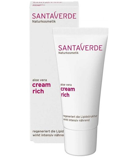 Anwendungsgebiet von Santaverde Aloe Vera Creme richSantaverde Aloe Vera Creme rich versorgt die Haut mit aufbauenden Pflegewirkstoffen und wirkt regenerierend. Reiner Aloe Vera Saft und antioxidatives Vitamin E optimieren die Feuchtigkeitsanreicherung. Reichhaltige Wirkstoffe aus Sheabutter und Arganöl nähren intensiv und wirken stärkend. Nachtkerzenöl wirkt beruhigend, rötungslindernd und regeneriert die Lipidstruktur. Hinterlässt die Haut genährt, gepflegt und geschützt. Besonders geeignet für trockene Haut.