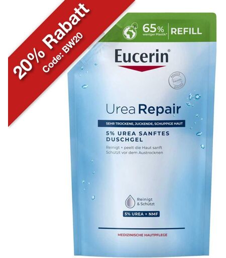 Anwendungsgebiet von Eucerin UreaRepair 5% Urea Sanftes Duschgel Nachfüllpackung BeutelDas Eucerin UreaRepair 5% Urea Sanftes Duschgel Nachfüllpackung Beutel schützt die Haut bei der Reingung vor dem Austrocknen und eignet sich damit hervorragend zur Hautpflege bei trockener, rauer und gereizter Haut.