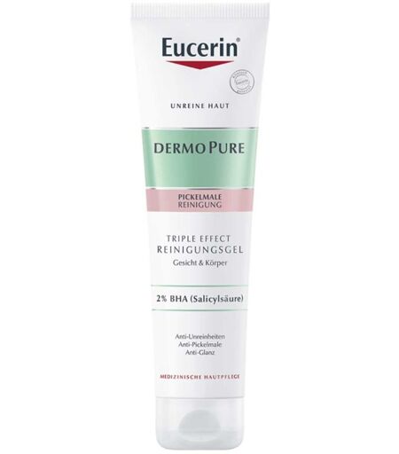 Das Eucerin DermoPure Triple Effect Reinigungsgel ist eine ideale Option für unreine Haut im Jugend- und Erwachsenenalter. Dreifach effektiv, ist das Waschgel fürs Gesicht nicht nur ein Make-up Entferner, sondern wirkt auch gegen Hautunreinheiten, Pickelmale und Glanz an. Es öffnet die Poren und bekämpft Unreinheiten mit 2% Salicylsäure. Mit seinem AHA/BHA/PHA-Säurekomplex entfernt das Gesichtsgel als Hautpeeling tote Zellen und mildert postinflammatorische Hyperpigmentierung in Form von Pickelmalen ab. Sein Anti-Glanz Effekt entsteht dadurch, dass das Hautpflegeprodukt nicht nur Make-up entfernt, sondern auch Schmutz und überschüssiger Talg.