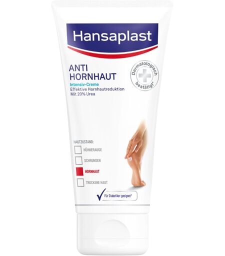 Anwendungsgebiet von Hansaplast Foot Expert Anti-Hornhaut Intensiv-CremeDie Hansaplast Anti Hornhaut Intensiv-Creme hilft Hornhaut zu entfernen und sehr trockene Füße zu pflegen. Mit 20 % des Wirkstoffs Urea entfernt die Hansaplast Anti Hornhaut Intensiv-Creme nicht nur effektiv Hornhaut, sondern spendet auch intensive Feuchtigkeit für trockene Füße. Urea erhöht die Fähigkeit der Haut Feuchtigkeit zu speichern und verbessert ihre natürliche Schutzfunktion. Bereits nach 4 Tagen zeigt die Anwendung der Fußpflege Creme erste Ergebnisse.* Die Anti Hornhaut Creme von Hansaplast ist auch für Diabetiker geeignet. Extra Pflege-Tipp: Für ein optimales Ergebnis zuvor das Hansaplast Anti Hornhaut 2in1 Peeling verwenden.** * Dermatologische Anwendungsstudie, 14 Tage, 33 Probanden, einschließlich Diabetiker ** Dermatologische Anwendungsstudie mit 14-tägiger Anwendung, 55 Probanden Wirkstoffe / Inhaltsstoffe / ZutatenAqua, Urea, Glycerin, Sodium Lactate, Cetearyl Alcohol, Glyceryl Glucoside, Hydrogenated Coco-Glycerides, Caprylic/Capric Triglyceride, Ethylhexyl Cocoate, Octyldodecanol, Cera Microcristallina, Dimethicone, Lactic Acid, Sorbitan Stearate, Aluminum Starch Octenylsuccinate, Phenoxyethanol, Paraffinum Liquidum, PEG-40 Castor Oil, Sodium Cetearyl Sulfate, Carbomer, Limonene, Citronellol, Geraniol, Parfum GegenanzeigenBei bekannter Überempfindlichkeit gegen einen der Inhaltsstoffe sollte dieses Produkt nicht angewendet werden. DosierungAnwendung: Zweimal am Tag auf die betroffenen Stellen, Fersen und Fußsohlen auftragen und gründlich einmassieren. Nur zur äußerlichen Anwendung, Kontakt mit Augen oder offenen Wunden vermeiden Hansaplast Foot Expert Anti-Hornhaut Intensiv-Creme können in Ihrer Versandapotheke www.juvalis.de erworben werden. ...