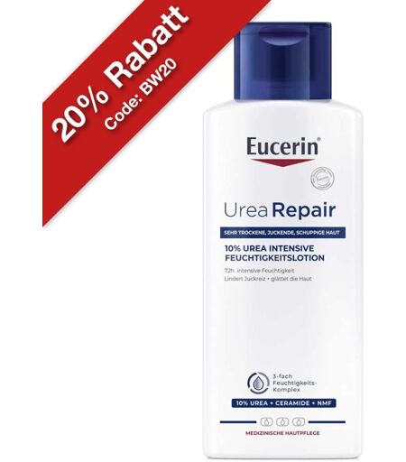Anwendungsgebiet von Eucerin® Urea Repair 10% Urea Intensive FeuchtigkeitslotionSehr trockene bis extrem trockene Haut wird mit der hochwirksamen Eucerin® Urea Repair 10% Urea Intensive Feuchtigkeitslotion intensiv gepflegt. Die Körpercreme schützt 72 Stunden langanhaltend vor Trockenheit und sorgt für 7x mehr Feuchtigkeit schon nach der ersten Anwendung.* Dank Wasser-in-Öl Formel zieht die Körperlotion schnell ein und macht die Haut glatt, geschmeidiger sowie widerstandsfähiger.