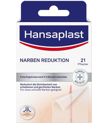 Anwendungsgebiet von Hansaplast Pflaster zur Behandlung von NarbenHansaplast Pflaster zur Behandlung von Narben sorgt für eine geringere Sichtbarkeit von alten und neuen Narben. Sie werden heller, flacher und weicher. Für den optimalen Einsatz im Alltag sind die selbstklebenden Narbenverbände von Hansaplast flexibel, atmungsaktiv und wasserfest. Darüber hinaus sind die Patches transparent zur diskreten Behandlung von Narben an sichtbaren Körperstellen. Die Pflaster enthalten keine Wirkstoffe (Medikamente), die Nebenwirkungen verursachen können und sind auch für empfindliche Haut geeignet.Wirkungsweise von Hansaplast Pflaster zur Behandlung von NarbenDas Pflaster kann für kleinere Narben zugeschnitten werden und mehrere können für große Wunden verwendet werden. Erste sichtbare Ergebnisse sind bereits nach 3-4 Wochen Narbenbehandlung mit den Pflastern möglich. Klinische Studien haben positive Ergebnisse bei einer täglichen Anwendung von mindestens 12 Stunden über einen Zeitraum von 8 Wochen gezeigt. Bei einer Anwendungsdauer von mehr als 8 Wochen kann der Behandlungserfolg weiter gesteigert werden.* *Schmidt A et al. (2001). Treating hypertrophic scars for 12 or 24 hours with a self-adhesive hydroactive polyurethane dressing. Journal of Wound Care 10(5):149-153. DosierungAnwendungsempfehlung von Hansaplast Pflaster zur Behandlung von Narben: Entfernen Sie die Schutzfolie vom selbstklebenden Heilungspflaster. Bringen Sie das Pflaster dann auf der sauberen, trockenen Haut an. Die Narbe muss vollständig bedeckt sein. Es wird ein täglicher Wechsel empfohlen. Hansaplast Pflaster zur Behandlung von Narben können in Ihrer Versandapotheke www.juvalis.de erworben werden. ...