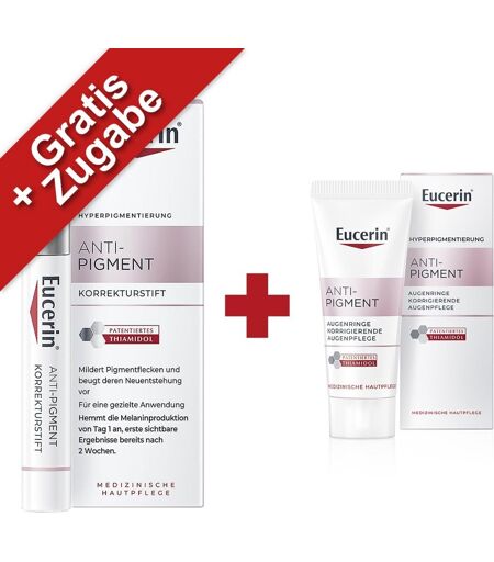 Wirkstoffe / Inhaltsstoffe / ZutatenEucerin Anti-Pigment Korrekturstift enthält: Aqua, Alcohol Denat, Glycerin, Cellulose Gum, Isobutylamido Thiazolyl Resorcinol (Thiamidol®), Glucosylrutin, Isoquercitrin, Citric Acid