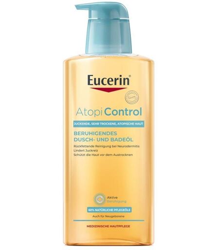Das Eucerin AtopiControl Dusch- und Badeöl ist speziell für die sanfte Reinigung und zur Beruhigung atopischer Haut geeignet. Die Formel der Eucerin Neurodermitis Hautpflege enthält 60% natürliche Pflegeöle (u.a. Sojaöl) und sorgt damit bei sehr trockener, gereizter und zu Ekzemen neigender Haut schon beim Duschen und Baden für intensive Rückfettung. Das Hautgefühl wird spürbar geschmeidiger, die Haut wird dank Sojaöl für die Haut vor dem Austrocknen geschützt und Juckreiz beruhigt. Das mikroplastikfreie* Duschöl eignet sich zur Körperpflege bei Neurodermitis während akuter wie auch in symptomfreier Phasen. Um das Risiko von Hautirritationen zu minimieren, ist das Eucerin AtopiControl Dusch-und Badeöl frei von Duft-, Farb- und Konservierungsstoffen und ohne Parfüm. Die Flasche des Eucerin Badeöls besteht aus 99% recyceltem Plastik (außer Etikett und Pumpe). Besondere Eigenschaften: Zum Duschen und Baden bei Neurodermitis Sanfte Reinigung für sehr trockene, gereizte und juckende Haut Pflegeprodukt kann sowohl als Duschöl wie auch als Badezusatz verwendet werden Hautpflege für Erwachsene, Kinder und Babys Parfümfrei, ohne Parabene, ohne Farbstoffe, ohne Konservierungsstoffe Anwendung: AtopiControl Beruhigendes Dusch- und Badeöl auf feuchter Haut auftragen, sanft einmassieren, dann gründlich abspülen. Die Haut sanft trocken tupfen, ohne zu reiben. Augenkontakt vermeiden. Bei Babys nur als Badezusatz verwenden. Für beste Ergebnisse in Kombination mit Eucerin AtopiControl Pflegeprodukten verwenden. *Gemäß UNEP-Definition. Inhaltsstoffe Glycine Soja Oil, Ricinus Communis Seed Oil, Laureth-4, MIPA-Laureth Sulfate, Poloxamer 101, Laureth-9, Tocopherol, Propylene Glycol, Aqua, Propyl Gallate, Citric Acid**Gutschein gültig bei Online-Bestellung ab dem genannten Mindestbestellwert (ausgenommen preisgebundene Bücher, verschreibungspflichtige Produkte, Artikel von Drittanbietern (Marktplatz Partnern) sowie bei einer Now!-Lieferung)) für die folgenden Produkte des Herstellers Beiersdorf AG Eucerin: 19169931, 16154610, 13929074, 14163929, 19729838, 15581586, 10832664, 11678159, 19358514, 19358514, 15294349, 15294332, 11678047, 17200737, 11678099, 14297073, 11678024, 11677993, 16502614, 11678001, 16236673, 11678142, 19116202, 15623422, 15210513, 8454781, 16510884, 8454775, 8454746, 12441459, 8454700, 19173499, 601656, 74458, 13889073, 13889096, 13889015, 19343346, 19343317, 13889021, 13889038, 8796286, 13889044, 13889268, 18099921, 13889133, 13889156, 13889179, 13889185, 13889191, 13889222, 13889239, 17929757, 13889251, 9508102, 9508094, 9508088, 9508065, 9508059, 9508071, 10779409, 14179451, 17882978, 13889216, 16807294. Voraussetzung ist die Angabe des Gutschein-Codes. Nur ein Gutschein pro Bestellung. Keine Kombination mit anderen Gutscheinen. Keine Barauszahlung. Gültig bis zum 01.12.2025. ...