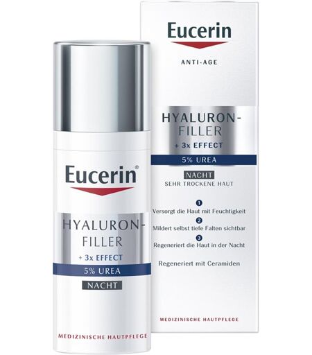 Anwendungsgebiet von Eucerin Anti-Age Hyaluron-Filler Urea Nacht CremeEucerin Anti-Age Hyaluron-Filler Urea Nacht Creme ist eine Anti-Age Pflege für trockene bis sehr trockene Haut. Die faltenmindernde Nachtpflege mit Hyaluron und Urea versorgt die Haut intensiv mit Feuchtigkeit und mindert Trockenheitsfältchen sowie ausgeprägte Falten.