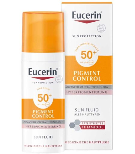 Anwendungsgebiet von Eucerin Sun Pigment Control Face Fluid LSF 50+Eucerin Sun Pigment Control Face Fluid LSF 50+ – Sehr hoher Sonnenschutz & sichtbare Milderung von vorhandenen Pigment- und Altersflecken.