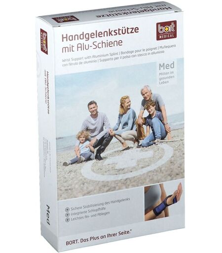 BORT Handgelenkstütze mit Alu-Schiene (Medianus-Schiene) Klassische Handgelenkbandage Volare Alu-Schiene, individuell anformbar, in strapazierfähiger Tasche Leichtes Anlegen/Abnehmen, auch bei eingeschränkter Greiffähigkeit durch integrierte Schlupfhilfe und dorsale Klettverschlüsse Länge: 16 cm Umfang Handgelenk Größen bis 15 cm Gr. XS 15 - 17 cm Gr. S 17 - 19 cm Gr. M 19 - 21 cm Gr. L 21 - 23 cm Gr. XL ...