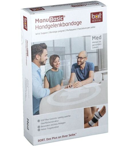 BORT Manu Basic ® Komprimierende Handgelenkbandage zur Stützung des Handgelenks SOFTflex-Gestrick für mehr Elastizität, Stabilität und hohen Tragekomfort Volare Schiene, anatomisch vorgeformt, thermoplastisch Stabilo®-Band, frei positionierbar Silikonpelotte mit Aussparung am Processus styloideus ulnaris DAS BASIC-PLUS Extra elastisch im Bereich des Handgelenks und des Unterarms, dadurch besonders leichtes Anlegen Indikationen Chronische, posttraumatische oder postoperative Reizzustände im Bereich des Handgelenks z. B. Distorsion Handwurzelarthrose Tendovaginitis Umfang Handgelenk Größen bis 13 cm x-small 13 - 15 cm small 15 - 17 cm medium 17 - 19 cm large 19 - 21 cm x-large ...