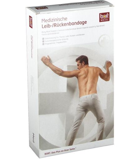 BORT Narbenbruch-Bandage Produktmerkmale Elastische Bandage zur Narbenbruchkompression Kunststoffverstärkte, abgerundete Silikonpelotte, individuell positionierbar Zwei Verstärkungsstäbe Elastisches, luftdurchlässiges Gewebe mit Klettverschluss Höhen: 13 cm, 21 cm, 26 cm Farbe weiß Das Med-Plus Abnehmbarer Pelottenbezug aus weichem Frottee-Stoff Höhe 13 cm: runde Pelotte mit 10 cm Durchmesser Höhe 21 cm: Pelotte 18 x 10 cm, oval Höhe 26 cm: Pelotte 22 x 10 cm, oval Indikationen Narbenbruch Narbeninsuffizienz Bauchmuskelschwäche/-lähmung Größen Umfang Taille Größe 1 60 - 95 cm Größe 2 95 - 125 cm Größe 3 125 - 150 cm Höhe 13 cm, 21 cm oder 26 cm angeben ...
