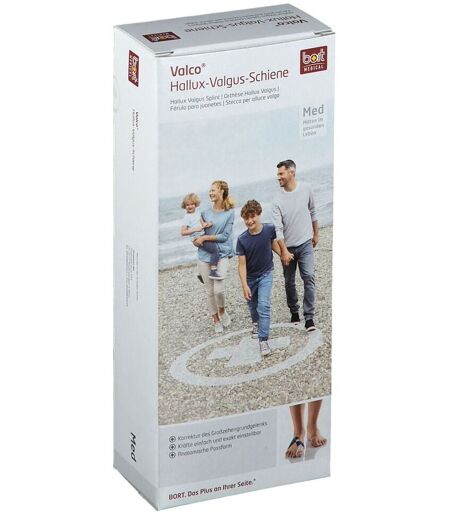 BORT Valco® Hallux-Valgus-Schiene Hallux-Valgus-Orthese zur physiologischen Korrektur des Großzehengrundgelenks Anatomische Passform Zwei verstellbare Verschlussbänder Vollflächige Kaschierung der Schieneninnenseite mit Schaumstoff Verpackung: Stück Größe Schuhgröße Gr. S bis 38 Gr. M 38-41 Gr. L über 41 ...