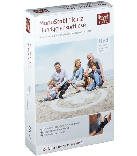 BORT ManuStabil® kurz Feste Handgelenkbandage mit volarer und dorsaler Verstärkungsschiene, individuell anformbar Kurze Ausführung; Länge: ca. 18 cm Stabilo®-Band zur effektiven Stabilisierung des Handgelenks Atmungsaktives Material Auch nachts zu tragen Umfang Handgelenk Größen 13 - 15 cm Kinder bis 15 cm Gr. XS 15 - 17 cm Gr. S 17 - 19 cm Gr. M 19 - 21 cm Gr. L 21 - 23 cm Gr. XL ...