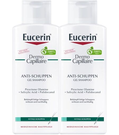 Anwendungsgebiet von Eucerin Dermocapillaire Anti-Schuppen Gel Shampoo DoppelpackEucerin® DermoCapillaire Anti-Schuppen Gel Shampoo – Haarpflege bei fettigen Schuppen & juckender Kopfhaut, 2 x 250 ml.Fettige Kopfhaut, fettige Haare und Schuppen gehen oft mit Juckreiz und Irritationen einher. Das Eucerin Dermocapillaire Anti-Schuppen Gel Shampoo Doppelpack wurde speziell für die Behandlung von fettigen Schuppen, Talgüberschuss und seborrhoischer Dermatitis entwickelt. Eucerin hat für die besonderen Bedürfnisse der zu Schuppen neigenden Kopfhaut nun einen 3-fachen Wirkansatz für das Haarshampoo entwickelt: die Triple Komplex Wirkstoff Kombination. Die neue Wirkstoff Kombination reduziert nachhaltig Schuppen, beruhigt die Kopfhaut und reduziert Juckreiz. Piroctone Olamine reduziert nachhaltig den Auslöser für die Überproduktion von Hornhautzellen auf der Kopfhaut, den Hefepilz namens Malassezia, und damit die Schuppenbildung. Polidocanol mindert und beruhigt den Juckreiz. Salicylsäure hilft, abgestorbene Hautzellen abzutragen. Als Ergänzung unterstützt Panthenol dabei, die Kopfhaut zu beruhigen. Bei regelmäßiger Anwendung stellt das Eucerin Shampoo das natürliche Gleichgewicht der Kopfhaut wieder her und sorgt durch seine sanfte Pflege für gesund glänzendes Haar sowie ein geschmeidiges Gefühl nach der Haarpflege. Das Anti Schuppen Shampoo enthält keine Duftstoffe und seine Hautverträglichkeit ist dermatologisch bestätigt, sodass das Gel-Shampoo auch für empfindliche Haut geeignet ist.In Tests bestätigten rund 89 % der Anwender ein gesünderes Aussehen von Haaren und Kopfhaut und knapp drei Viertel den guten Anti-Schuppen Effekt.* (*Eucerin Product-in-use test, n=88, 2020)Wirkungsweise von Eucerin Dermocapillaire Anti-Schuppen Gel Shampoo DoppelpackSie neigen zu fettenden Haaren mit Schuppenbildung? Dann hilft Ihnen Eucerin Dermocapillaire Anti-Schuppen Gel Shampoo Doppelpack.
