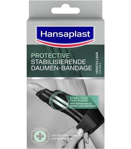 Anwendungsgebiet von Hansaplast Daumen-Bandage Stabilisierend Hansaplast Protective Stabilisierende Daumen-Bandage - Schutz und Entlastung, aktive ErholungHansaplast Protective Stabilisierende Daumen-Bandage - Für stabilisierenden Halt. Die Hansaplast Daumen-Bandage Stabilisierend hilft schwache oder verletzte Daumen zuverlässig zu stabilisieren und bietet Schutz vor weiteren Verletzungen.Der Stabilizing Pain Guard ermöglicht Entlastung und Stabilität durch:Pro Stability Inlays: integrierte Schienen stabilisieren den Daumen360° Support Technology: bietet Rundumunterstützung & Stabilität für den DaumenDynamisch anpassbarer Druck: verringert Überlastung, um Schmerzen zu mindernThermo-Tech Material: bietet Wärme, um die Blutzirkulation und damit die Regeneration zu fördernGegenanzeigenBei bekannter Überempfindlichkeit gegenüber einen der oben genannten Inhaltsstoffe sollten die Produkte nicht angewendet werden.DosierungAnwendungsempfehlung von Hansaplast Daumen-Bandage Stabilisierend:ANLEGEN DER BANDAGE: 1. Verschluss am Handgelenk und am Daumen önen. Die Hand in die Bandage führen und den Daumen in der Daumenöffnung platzieren. 2. Den Handgelenksklettverschluss um das Handgelenk führen und schließen. 3. Das Daumenband um den Daumen legen und schließen. Mit den Klettverschlüssen den individuell gewünschten Halt einstellen.HinweiseANDWENDUNGSHINWEISE: Nur auf sauberer, unverletzter Haut anwenden. Das Produkt sollte wie beschrieben angelegt werden. Stellen Sie sicher, dass die Bandage weder zu eng anliegt noch die Blutzirkulation einschränkt. Vermeiden Sie das Tragen über einen längeren Zeitraum oder während des Schlafes. Wenden Sie sich bei Fragen zu Ihren Beschwerden an Ihren Arzt oder Ihre Ärztin. Nicht anzuwenden bei Durchblutungsstörungen oder einer bekannten Allergie gegen eines der genannten Materialien. Sollten Hautirritationen auftreten, die Schmerzen anhalten oder sich verschlimmern, beenden Sie die Anwendung und konsultieren Si ...