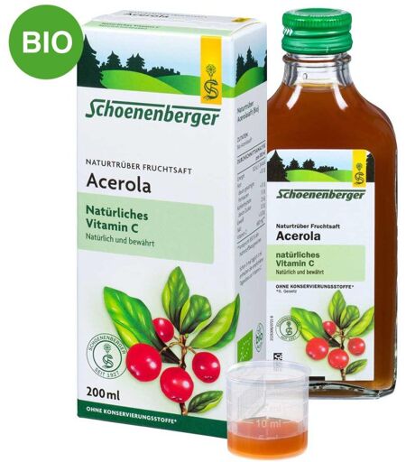 Anwendungsgebiet von Schoenenberger Naturtrüber Fruchtsaft Acerola Schoenenberger Naturtrüber Fruchtsaft Acerola sind ein Nahrungsergänzungsmittel mit Saft aus Bio-Acerolakirschen. Vor allem positiv ist, dass sich der Fruchtsaft Acerola für alle eignet, die auf Zitrusfrüchte allergisch reagieren. Die Acerola-Kirsche verfügt über einen besonders hohen Gehalt an Vitamin C. Vitamin C fördert viele Prozesse im Körper. Fehlt es an Vitamin C, dann ist der Körper in seiner eigenen Abwehr geschwächt und anfällig für Krankheitserreger. Mit einer vorbeugenden oder ergänzenden Einnahme von Schoenenberger Naturtrüber Fruchtsaft Acerola wird das Immunsystem und der Körper in seiner Aktivität unterstützt.Schoenenberger Naturtrüber Fruchtsaft Acerola ist die Quelle für natürliches Vitamin C. Da Vitamin C vielfältige unterstützende Funktionen im Körper übernimmt, kann der Saft in vielen Situationen angewendet werden. Vitamin C trägt nicht nur zur normalen Funktion des Immunsystems bei, sondern unterstützt auch die Verminderung von Müdigkeit und Erschöpfung. Außerdem unterstützt Vitamin C die Zellen vor oxidativen Stress zu schützen.Wirkungsweise von Schoenenberger Naturtrüber Fruchtsaft Acerola
