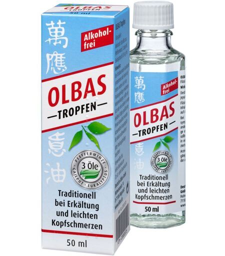 Olbas Tropfen sind ein bewährtes, konzentriertes Hausmittel, das nach alter Überlieferung als reines Destillat ätherischer Öle aus wertvoller Pfefferminze, Kajeput, Eukalyptus, Wacholderbeeren und Wintergrün gewonnen wird. Olbas Tropfen enthalten keinen Alkohol. Sie wirken schmerzlindernd und antibakteriell und können innerlich, äußerlich und zur Inhalation verwendet werden. Schon wenige Tropfen reichen aus. OLBAS Tropfen Innerlich: Zum Einnehmen – Äußerlich: Zum Einreiben Pflanzliches Arzneimittel. Anwendungsgebiete: Innerlich: Erkältung, Husten, Heiserkeit, Schnupfen, Katarrh, Erschöpfung, Leibschmerzen – Magenschmerzen nervöser Art, Darmkatarrh. Äußerlich: Kopfschmerzen, Nervenschmerzen – Neuralgie, Erschöpfungszustände, rheumatische Beschwerden, Verstauchungen, Wadenkrampf, kleine Wunden, Zahnschmerzen. Gegenanzeigen: Olbas Tropfen dürfen nicht angewendet werden bei bekannter Überempfindlichkeit gegenüber den Wirkstoffen Cajeputöl, Eucalyptusöl und/oder Pfefferminzöl, gegen Cineol und/oder Menthol, die Hauptbestandteile von Cajeput/Eucalyptusöl bzw. Pfefferminzöl sowie gegenüber den sonstigen Bestandteilen, bei Bronchialasthma oder anderen Atemwegserkrankungen, die mit einer ausgeprägten Überempfindlichkeit der Atemwege einhergehen, bei Säuglingen und Kleinkindern unter 2 Jahren (Gefahr eines Stimmritzenkrampfes mit Atemstillstand). Bei Verschluss der Gallenwege und schweren Leberschäden sollen Olbas Tropfen nicht innerlich angewendet werden. Vorsichtsmaßnahmen für die Anwendung und Warnhinweise: Bei akuten Beschwerden, die z.B. mit Rötung, Schwellung oder Überwärmung einhergehen, sowie bei andauernden Beschwerden muss ein Arzt aufgesucht werden. Nach der Anwendung mit Olbas Tropfen sind die Hände gründlich zu reinigen; so kann ein Kontakt mit empfindlichen Körperstellen wie Augen und Schleimhäuten vermieden werden. Es sollte darauf geachtet werden, dass Kinder mit ihren Händen nicht mit den eingeriebenen Hautpartien der Behandelten in Kontakt gelangen können. Zur Anwendung dieses Arzneimittels bei Kindern liegen keine ausreichenden Untersuchungen vor. Es soll deshalb bei Kindern unter 12 Jahren nicht angewendet werden. Olbas Tropfen sollten wegen nicht ausreichender Untersuchungen in Schwangerschaft und Stillzeit nicht angewendet werden. Wechselwirkungen mit anderen Arzneimitteln: Sind nicht bekannt. Dosierungsanleitung und Art der Anwendung: Erwachsene und Jugendliche über 12 Jahre: Innerliche Anwendung: 3 mal täglich 3 – 4 Tropfen auf Zucker oder in etwas lauwarmem Wasser einnehmen. 2 – 4 Tropfen mit heißem Wasser inhalieren, mit 3 – 4 Tropfen in lauwarmem Wasser gurgeln. Äußerliche Anwendung: Als Einreibung 2 – 4 mal täglich 5 – 15 Tropfen auf die Haut auftragen und verreiben. Bei feuchtkalten Umschlägen einige Tropfen dem Umschlagwasser zusetzen. Die Dauer der Anwendung ist abhängig von Art, Schwere und Verlauf der Erkrankung. Beachten Sie aber bitte in jedem Fall die Angaben im ersten Absatz unter „Vorsichtsmaßnahmen für die... ...