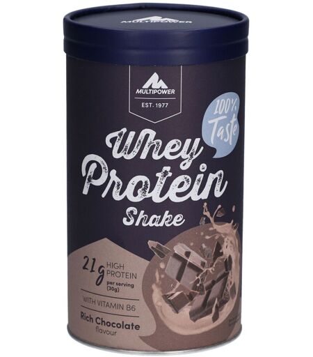 Nahrungsergänzungsmittel sind kein Ersatz für eine ausgewogene und abwechslungsreiche Ernährung und eine gesunde Lebensweise.Multipower Whey Protein Shake SchokoladeDer Multipower Whey Protein Shake 420g mit Schokoladen-Geschmack ist die ideale Wahl für alle, die ihre Muskeln nach dem Training schnell und effektiv versorgen möchten. Mit einer Kombination aus Whey-Konzentrat, -Isolat und eiweißangereichertem Molkepulver liefert jede Portion mindestens 21g hochwertiges Protein. Angereichert mit Vitamin B6 unterstützt der Shake den Protein- und Hormonstoffwechsel. In einer nachhaltigen Pappwickeldose verpackt, überzeugt das Pulver mit hervorragender Löslichkeit und leckerem Geschmack. Perfekt für den Einsatz nach dem Training oder als Snack zwischendurch.Zutaten:83% Molkenproteinkonzentrat, 8% Molkenproteinisolat, 5% fettarmes Kakaopulver, Aroma, 1% eiweißangereichertes Molkenpulver, Emulgator (Lecithine), Salz, Verdickungsmittel (Guarkernmehl), Süßungsmittel (Acesulfam-K, Sucralose), Vitamin B6. Kann Spuren von Ei und Soja enthalten.Nährwertangaben: Nährwert Menge Energie 112 kcal Protein 21 g Kohlenhydrate 2,6 g Fett 1,5 g Ballaststoffe 0 g Salz 0,15 g Verzehrsempfehlung:30g Pulver (ca. 3 gehäufte Esslöffel) in 200ml Wasser oder fettarmer Milch einrühren. Morgens, nach dem Training oder als Snack einnehmen.Aufbewahrungs- & Verwendungshinweis:Nahrungsergänzungsmittel sollten nicht als Ersatz für eine ausgewogene Ernährung dienen.Kühl und trocken lagern. Für Kinder unzugänglich aufbewahren.Nettofüllmenge:420g (ca. 14 Portionen)Hestellerdaten:Multipower GmbH ...