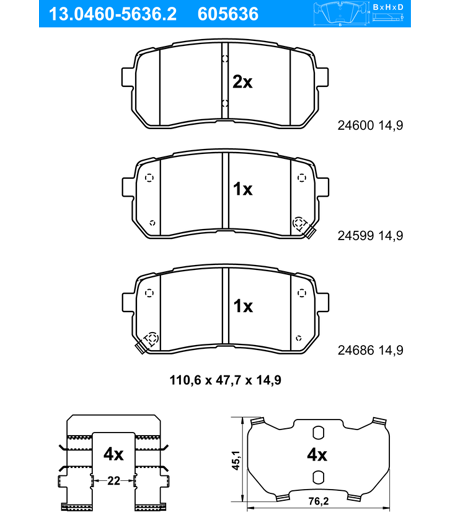 ATE Bremsbelagsatz, Scheibenbremse Ergänzungsartikel/Ergänzende Info:mit Zubehör Höhe [mm]:47,7 mm Bremssystem:Mando Breite [mm]:110,6 mm Verschleißwarnkontakt:mit akustischer Verschleißwarnung Prüfzeichen:E9 90R-01229/2495 Ergänzungsartikel/Ergänzende Info 2:mit Anti-Quietsch-Blech Dicke/Stärke [mm]:14,9 mm MAPP-Code vorhandenMenge 1 entspricht einem Satz (4 Bremsbeläge für links UND rechts) , u.a. für Hyundai H-1 (TQ), 2497 cm³, 136 PS (100 kW), ab 7/2008, KBA-Nr: 8252ADGHyundai Ix55, 2959 cm³, 250 PS (184 kW), 9/2011 bis 12/2012, KBA-Nr: 8252AFLHyundai H-1 (TQ), 2497 cm³, 170 PS (125 kW), ab 2/2008, KBA-Nr: 8252ACYHyundai H-1 (TQ), 2497 cm³, 170 PS (125 kW), ab 5/2008, KBA-Nr: 8252ACWHyundai Ix55, 2959 cm³, 239 PS (176 kW), 9/2008 bis 12/2011, KBA-Nr: 8252ADKHyundai H-1 (TQ), 2359 cm³, 175 PS (129 kW), ab 3/2008Hyundai H-1 (TQ), 2497 cm³, 110 PS (81 kW), ab 2/2008, KBA-Nr: 5984AAGHyundai H-1 (TQ), 2359 cm³, 175 PS (129 kW), ab 2/2008Hyundai Ix55, 3778 cm³, 264 PS (194 kW), ab 1/2011Hyundai H-1 (TQ), 2497 cm³, 163 PS (120 kW), ab 2/2008, KBA-Nr: 8252ACZHyundai H-1 (TQ), 2497 cm³, 116 PS (85 kW), ab 1/2009, KBA-Nr: 8252ADMHyundai H-1 (TQ), 2497 cm³, 136 PS (100 kW), ab 8/2009, KBA-Nr: 8252ADQHyundai H-1 (TQ), 2497 cm³, 163 PS (120 kW), ab 5/2008, KBA-Nr: 8252ACVHyundai H-1 (TQ), 2497 cm³, 116 PS (85 kW), ab 8/2011, KBA-Nr: 8252ADHHyundai H-1 (TQ), 2497 cm³, 128 PS (94 kW), ab 1/2009Hyundai H-1 (TQ), 2497 cm³, 110 PS (81 kW), ab 7/2010, KBA-Nr: 8252ADIKIA Sorento III (UM), 2199 cm³, 200 PS (147 kW), ab 1/2015, KBA-Nr: 8253AFKKIA Sorento III (UM), 2199 cm³, 200 PS (147 kW), ab 1/2015, KBA-Nr: 8253AFLKIA Sorento III (UM), 2359 cm³, 188 PS (138 kW), ab 1/2015, KBA-Nr: 8253AFIKIA Sorento III (UM), 2359 cm³, 188 PS (138 kW), ab 1/2015, KBA-Nr: 8253AFHKIA Sorento III (UM), 3342 cm³, 271 PS (199 kW), ab 4/2015, KBA-Nr: 8253AFTKIA Sorento III (UM), 2359 cm³, 175 PS (129 kW), ab 1/2015KIA Sorento III (UM), 2199 cm³, 197 PS (145 kW), ab 11/2016KIA Sorento III (UM), 2199 cm³, 193 PS (142 kW), ab 11/2016KIA Sorento III (UM), 3342 cm³, 271 PS (199 kW), ab 4/2015, KBA-Nr: 8253AFUKIA Sorento III (UM), 1995 cm³, 185 PS (136 kW), ab 7/2015, KBA-Nr: 8253AFJKIA Sorento III (UM), 2199 cm³, 202 PS (149 kW), ab 1/2015Hyundai Ix55, 2959 cm³, 256 PS (188 kW), 3/2012 bis 11/2012KIA Sorento III (UM), 3470 cm³, 249 PS (183 kW), ab 12/2018 , OE-Nummer:BREMBO:P30035NQUINTON HAZELL:BP1599BREMBO:P 30 035CIFAM:822-786-0ICER:181839-067BOSCH:0 986 494 327VALEO:606497JURID:572596JICER:181839GALFER:G1021486NIPPARTS:N3610308ROADHOUSE:21288.02BREMBO:P 30 080REMSA:1288.02TEXTAR:2459901GALFER:B1.G102-1486.2METELLI:22-0786-0HERTH+BUSS JAKOPARTS:J3610504TRW:GDB3449 ...