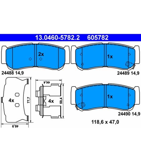 Breite [mm]: 118,6. Bremssystem: Mando. Dicke [mm]: 14,9. Hersteller: ATE. Herstellernummer: 13.0460-5782.2. Höhe [mm]: 47. Index: 13.0460-5782.2. Montage Achse: Hinten. Produktart: Bremsbelagsatz. Typprüfung: E1 90R-011242/1177. Verschleißkontakt: Ja. Verschleißkontakttyp: akustisch. WVA-Nummer: 24488,24489,24490. ...