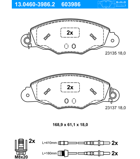 ATE Bremsbelagsatz, Scheibenbremse Verschleißwarnkontakt:inkl. Verschleißwarnkontakt Ergänzungsartikel/Ergänzende Info 2:mit Bremssattelschrauben Prüfzeichen:E1 90R-01917/364 Dicke/Stärke [mm]:18,0 mm Breite [mm]:168,9 mm Anzahl der Schrauben:2 Anzahl Verschleißanzeiger [pro Achse]:4 pro Achse Bremssystem:Bosch MAPP-Code vorhanden Höhe [mm]:61,1 mmMenge 1 entspricht einem Satz (4 Bremsbeläge für links UND rechts) , u.a. für Citroën XM (Y4), 2446 cm³, 129 PS (95 kW), 5/1994 bis 10/2000, KBA-Nr: 3001255Citroën XM (Y4), 2446 cm³, 129 PS (95 kW), 5/1994 bis 10/2000, KBA-Nr: 3001256Citroën Xantia (X1, X2), 2946 cm³, 190 PS (140 kW), 1/1997 bis 4/2003, KBA-Nr: 3001608Citroën XM (Y4), 2946 cm³, 190 PS (140 kW), 4/1997 bis 10/2000, KBA-Nr: 3001649Citroën XM (Y4), 2946 cm³, 190 PS (140 kW), 4/1997 bis 10/2000, KBA-Nr: 3001637Citroën Xantia (X1, X2), 2946 cm³, 190 PS (140 kW), 1/1998 bis 4/2003, KBA-Nr: 3001698Citroën Xantia (X1, X2), 1997 cm³, 109 PS (80 kW), 2/1999 bis 4/2003, KBA-Nr: 3001716Citroën Xantia (X1, X2), 1997 cm³, 109 PS (80 kW), 2/1999 bis 4/2003, KBA-Nr: 3001717 , OE-Nummer:QUINTON HAZELL:0659.04FEBI BILSTEIN:16414JURID:573004JICER:181278TEXTAR:2313503GALFER:G1021144GALFER:B1.G102-1144.2TRW:GDB1336QUINTON HAZELL:BP1077VALEO:598420FERODO:FDB1114FERODO:FSL1114MINTEX:MDB1939HELLA PAGID:8DB 355 019-331NK:221921FTE:BL1661A4BREMBO:P 61 061BOSCH:0 986 424 511NECTO:FD6699ATEXTAR:23135 180 1 5 T4110ZIMMERMANN:23134.180.1DELPHI:LP1554DELPHI:LP1629MGA:444PAGID:T9095TEXTAR:23135 180 1 5REMSA:0659.04ROADHOUSE:2659.04HELLA:8DB 355 019-331 ...