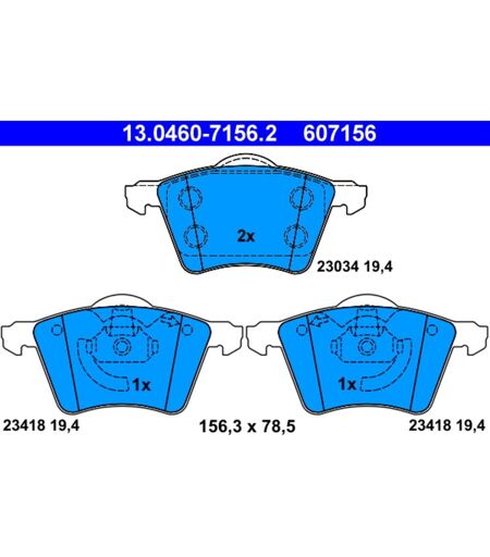 Breite [mm]: 156,3. Bremssystem: ATE. Dicke [mm]: 20,3. Hersteller: ATE. Herstellernummer: 13.0460-7156.2. Höhe [mm]: 78,5. Index: 13.0460-7156.2. Montage Achse: Vorne. Produktart: Bremsbelagsatz. Typprüfung: E1 90R-01451/383. Verschleißkontakt: Nein. Vorbereitung für Verschleißkontakt: Nein. WVA-Nummer: 23034,23418. ...