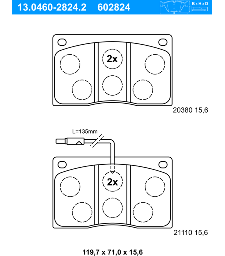 ATE Bremsbelagsatz, Scheibenbremse Verschleißwarnkontakt:inkl. Verschleißwarnkontakt Höhe [mm]:71,0 mm Prüfzeichen:E9 90R-01279/217 Breite [mm]:119,7 mm Dicke/Stärke [mm]:15,6 mm Bremssystem:Lucas / TRW Warnkontaktlänge [mm]:135 mm MAPP-Code vorhandenMenge 1 entspricht einem Satz (4 Bremsbeläge für links UND rechts) , u.a. für Renault Master I (T), 2499 cm³, 94 PS (69 kW), 8/1989 bis 7/1998Renault Master I (T), 2499 cm³, 75 PS (55 kW), 8/1989 bis 7/1998Renault Master I (T), 2165 cm³, 91 PS (67 kW), 8/1980 bis 7/1998Renault Master I (T), 1995 cm³, 80 PS (59 kW), 8/1980 bis 9/1986Renault Master I (T), 1995 cm³, 79 PS (58 kW), 10/1986 bis 7/1998Renault Master I (T), 2068 cm³, 60 PS (44 kW), 8/1980 bis 7/1998Renault Master I (T), 2445 cm³, 71 PS (52 kW), 8/1980 bis 8/1989Renault Master I (T), 2499 cm³, 98 PS (72 kW), 8/1989 bis 7/1998Renault Master I (P), 1995 cm³, 80 PS (59 kW), 10/1982 bis 9/1986Renault Master I (P), 2445 cm³, 71 PS (52 kW), 9/1980 bis 7/1998Renault Master I (T), 1995 cm³, 80 PS (59 kW), 8/1980 bis 10/1986Renault Master I (P), 1995 cm³, 79 PS (58 kW), 10/1986 bis 7/1998Renault Master I (T), 2445 cm³, 71 PS (52 kW), 7/1983 bis 8/1986Renault Master I (P), 2499 cm³, 75 PS (55 kW), 7/1980 bis 10/1989Renault Master I (P), 1995 cm³, 80 PS (59 kW), 7/1980 bis 6/1985Renault Master I (T), 2445 cm³, 72 PS (53 kW), 9/1986 bis 10/1989 , OE-Nummer:GALFER:B1.G102-1011.2QUINTON HAZELL:BP503BOSCH:0 986 460 932TEXTAR:2038001TEXTAR:2038002NECTO:FD210QUINTON HAZELL:BP164ICER:140544FERODO:FVR805FERODO:FDB805MINTEX:MGB585QUINTON HAZELL:0044.02ZIMMERMANN:20380.155.2TEXTAR:20380 156 0 4NECTO:FD211NFERODO:FSL805TEXTAR:20380 156 0 5QUINTON HAZELL:BLF503NECTO:FD211VMINTEX:MGB443HELLA PAGID:8DB 355 005-931ROADHOUSE:2044.02BOSCH:0 986 560 932LPR:05P372REMSA:0044.02BERAL:20 380 15.50 40 4FEBI BILSTEIN:16444JURID:571321JLPR:05P386NK:223921MGA:155FERODO:FDB817PAGID:T0210PAGID:T1266FERODO:TAR805GALFER:G1021011HELLA:8DB 355 005-931DELPHI:LP568BREMBO:P 68 012TRW:GDB443TRW:GDB585FTE:BL1233A2VALEO:598374BARUM:BA2019 ...