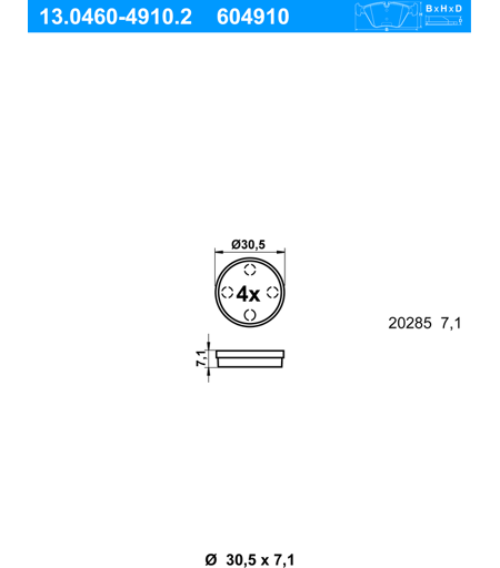 ATE Bremsbelagsatz, Scheibenbremse Durchmesser [mm]:30,5 mm Dicke/Stärke [mm]:7,1 mm Bremssystem:Citroen Verschleißwarnkontakt:exkl. Verschleißwarnkontakt Verschleißwarnkontakt:nicht für Verschleißwarnanzeiger vorbereitet MAPP-Code vorhandenMenge 1 entspricht einem Satz (4 Bremsbeläge für links UND rechts) , u.a. für Citroën 2 Cv, 602 cm³, 24 PS (18 kW), 9/1975 bis 6/1981, KBA-Nr: 3001370Citroën 2 Cv, 602 cm³, 27 PS (20 kW), 8/1979 bis 7/1990, KBA-Nr: 3001430Citroën 2 Cv, 602 cm³, 29 PS (21 kW), 2/1970 bis 10/1985, KBA-Nr: 3001303 , OE-Nummer:JURID:571891JNK:221912BOSCH:0 986 462 850NECTO:FD123PAGID:T0123TEXTAR:20285 071 0 4ICER:180125TEXTAR:20285 071 0 5REMSA:0070.00FTE:BL1049A1QUINTON HAZELL:BP247TRW:GDB271QUINTON HAZELL:BLF247DELPHI:LP347MGA:38TEXTAR:2028502QUINTON HAZELL:0070.00ROADHOUSE:2070.00VALEO:598362BREMBO:P 61 003MINTEX:MDB1521FERODO:FDB58 ...