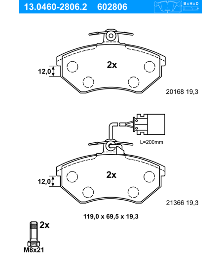 ATE Bremsbelagsatz, Scheibenbremse Verschleißwarnkontakt: inkl. Verschleißwarnkontakt Ergänzungsartikel/Ergänzende Info 2: mit Bremssattelschrauben number_of_boltsscrews_1535: Anzahl der Schrauben: 2 Warnkontaktlänge: 200 mm Dicke/Stärke: 19,3 mm Breite: 119 mm Höhe: 69,5 mm Bremssystem: Lucas / TRW MAPP-Code vorhanden:: Menge 1 entspricht einem Satz (4 Bremsbeläge für links UND rechts) , u.a. für VW Golf III (1H1), 1984 cm³, 115 PS (85 kW), 11/1991 bis 8/1997, KBA-Nr: 0600893VW Golf III (1H1), 1984 cm³, 150 PS (110 kW), 8/1992 bis 8/1997, KBA-Nr: 0600908VW Golf III (1H1), 2792 cm³, 174 PS (128 kW), 1/1992 bis 8/1997, KBA-Nr: 0600894VW Vento (1H2), 1984 cm³, 115 PS (85 kW), 11/1991 bis 9/1998, KBA-Nr: 0600900VW Vento (1H2), 2792 cm³, 174 PS (128 kW), 1/1992 bis 9/1998, KBA-Nr: 0600901VW Vento (1H2), 1984 cm³, 107 PS (79 kW), 5/1996 bis 12/1997VW Golf III (1H1), 2792 cm³, 163 PS (120 kW), 8/1995 bis 9/1997 , OE-Nummer:VALEO:598304LPR:05P495FEBI BILSTEIN:16316HELLA PAGID:8DB 355 017-971BOSCH:0 986 560 948FERODO:TAR951VALEO:301982FERODO:FDB907TRW:GDB1281VALEO:168507PAGID:T5059DELPHI:LP769NK:229984REMSA:0134.62ICER:180996TRW:GDB1057FTE:BL1303B2QUINTON HAZELL:BP608MINTEX:MDB1700ROADHOUSE:2134.62HELLA:8DB 355 017-971TEXTAR:20168 196 1 5 T438VALEO:598982BOSCH:0 986 460 948FERODO:FDB951BOSCH:F 026 000 095PAGID:T5059-ECODELPHI:LP1412QUINTON HAZELL:0134.62QUINTON HAZELL:BLF608TEXTAR:2016805ICER:181216FTE:BL1303A2BREMBO:P 85 034ZIMMERMANN:20168.190.1JURID:571856JTEXTAR:20168 196 1 5 ...